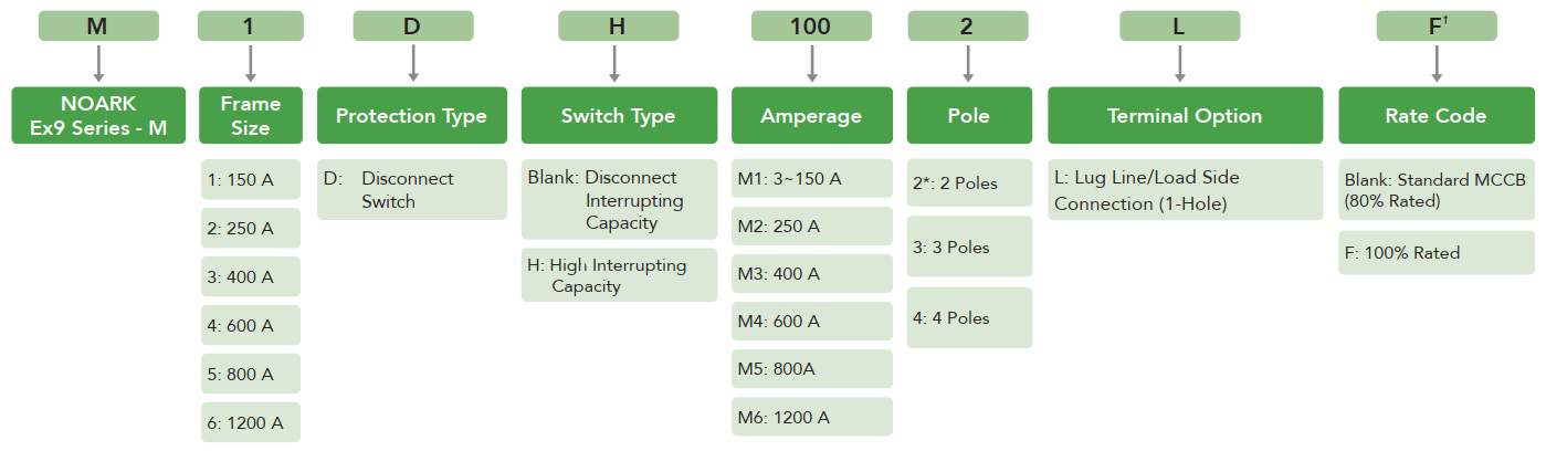 NOARK Electric offers a complete range of Molded Case Switches in six frame sizes: M1 – 150 A, M2 – 250 A, M3 – 400 A, M4 – 600 A, M5 – 800 A, and M6 – 1,200 A.